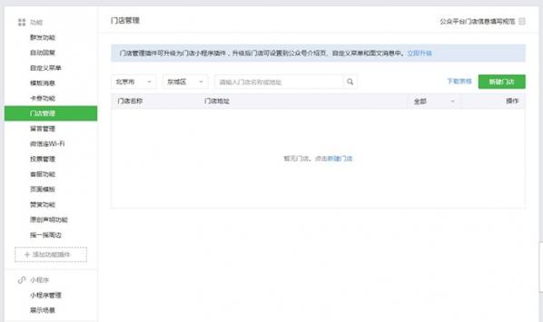 没有“门店管理”功能的公众号,可在“添加功能插件”—“门店小程序”申请开通。 已有“门店管理”功能的公众号,可以把 “门店管理”升级为“门店小程序”。